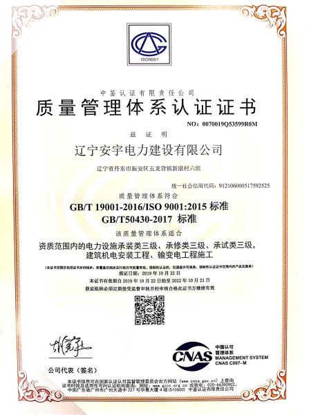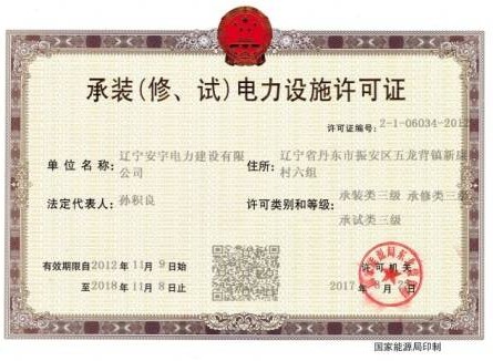 安宇電建獲得地基基礎工程叁級資質(zhì),建筑機電安裝工程承包叁級資質(zhì),輸變電工程承包叁級資質(zhì)及東北能源局叁級承裝,叁級承修,叁級承試資質(zhì)